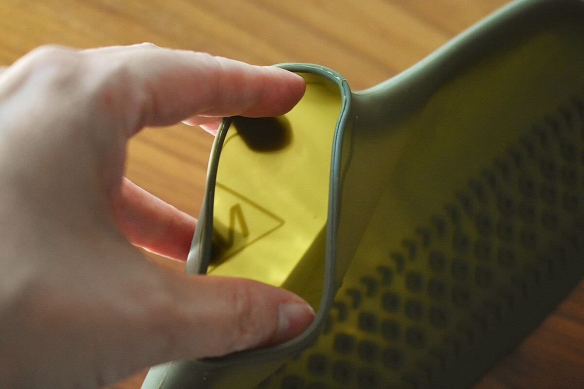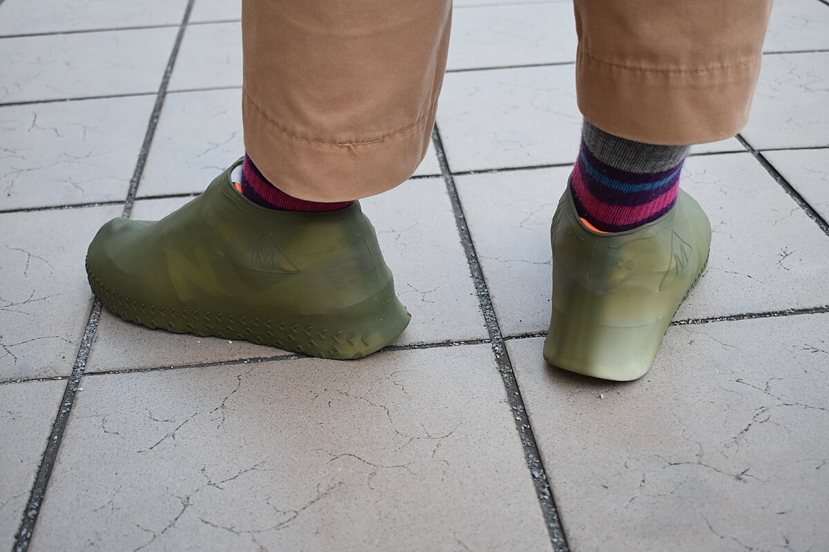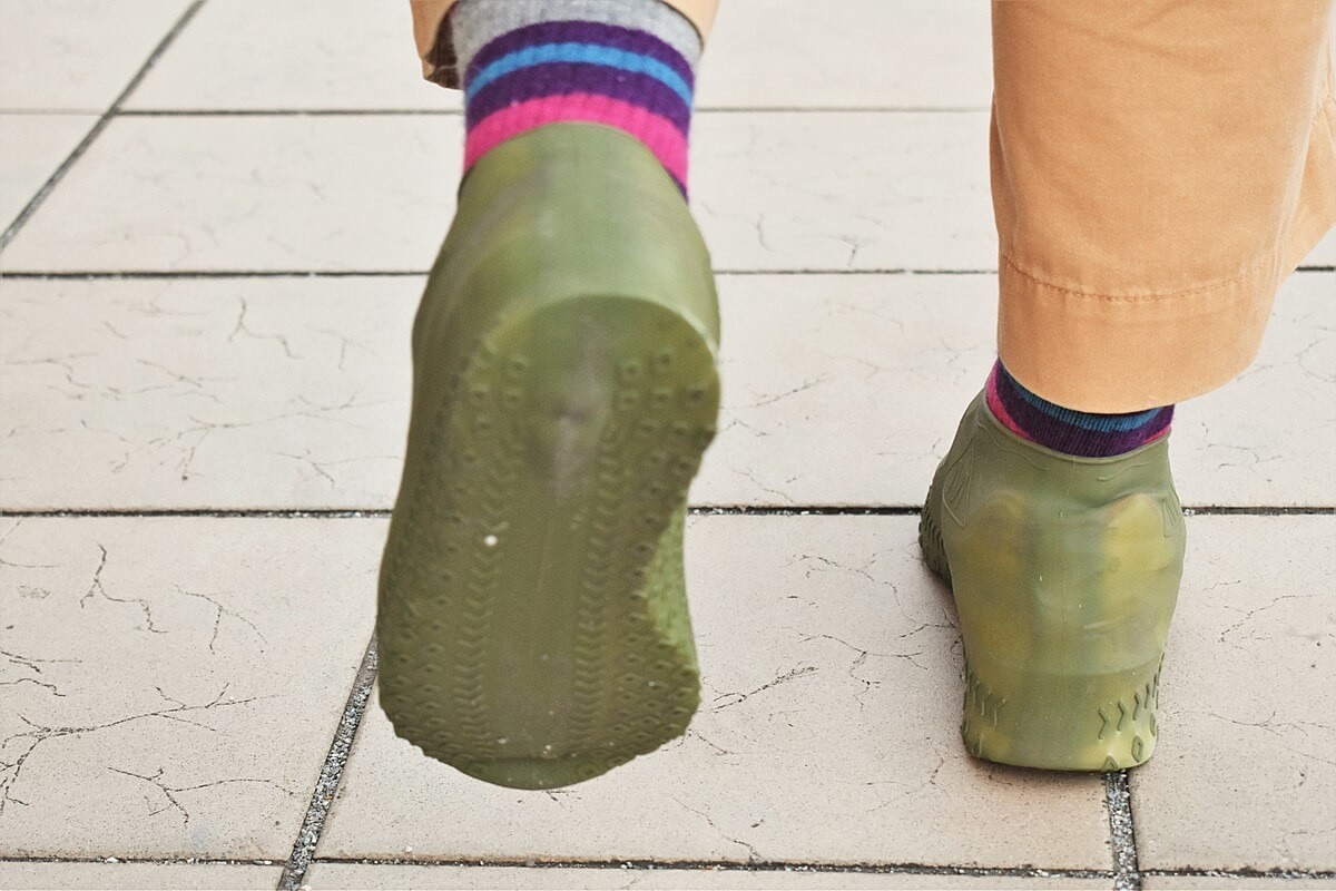 筆者のスニーカーはツルツルしたタイルの上ではすべってしまうこともあり、雨の日に怖い思いをしたことが何度かあるのですが、実際に雨の日に筆者が履いてみたところ、シリコンなので滑りにくくなりました。