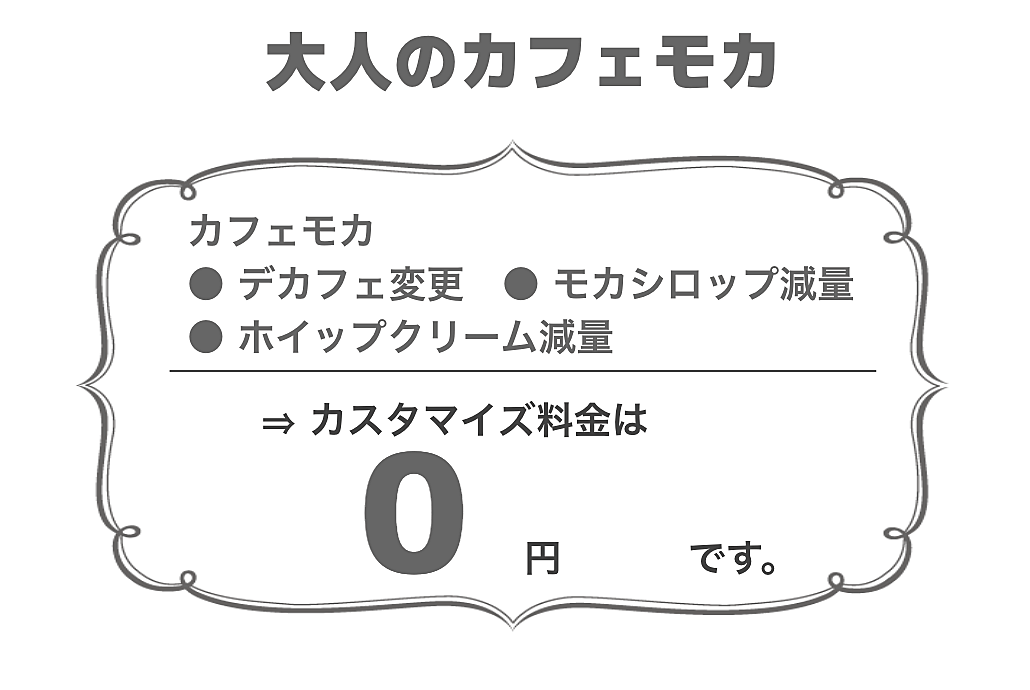 通常のカフェモカは、チョコレートシロップを少し多めに使用して作られています。そのため、甘いドリンクが苦手という方は、甘さが強く感じてしまうかもしれません。そんな時には、こちらのように、「シロップ減量」のカスタマイズを行うことで、ラテ本来の味を強く出したドリンクに仕上げることができます。