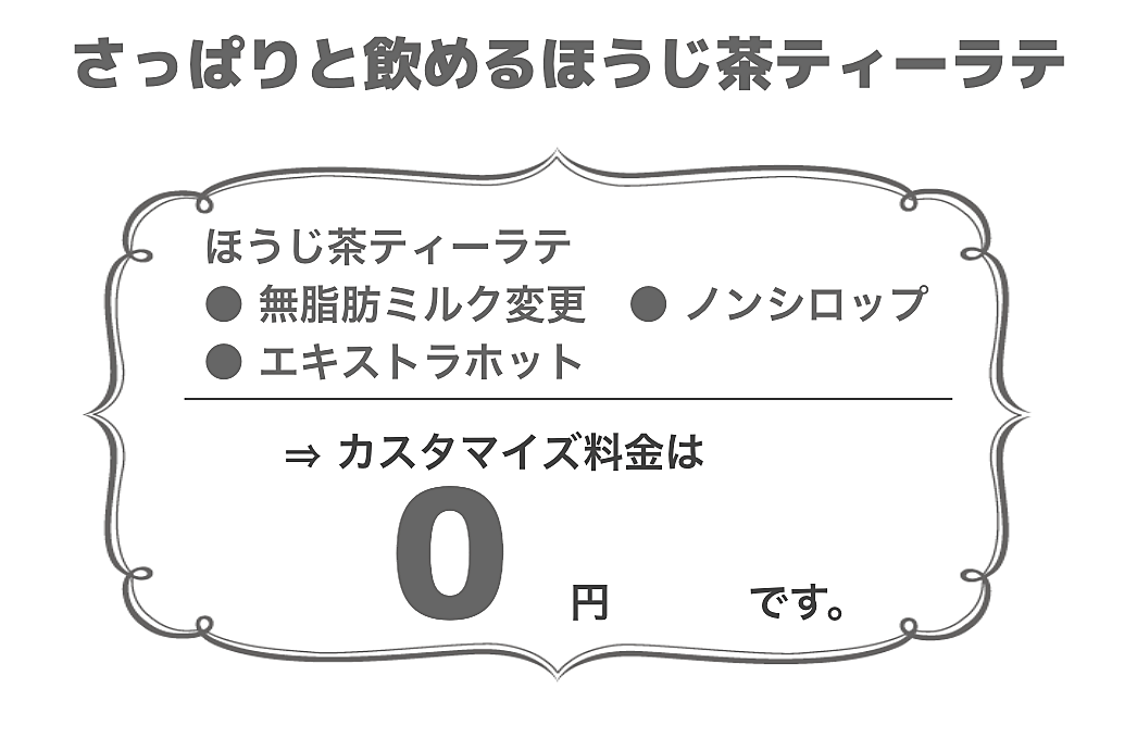 こちらは、ほうじ茶ティーラテに使用しているシロップを削除し、ミルクを無脂肪ミルクに変更したカスタマイズドリンク。