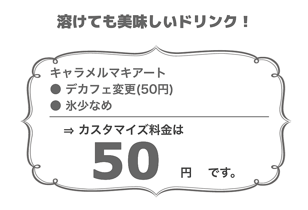 これら全てのカスタマイズを闇雲に使用すれば、美味しいドリンクに仕上げるという訳でもありません。それぞれのドリンクに相性の良いカスタマイズがあり、正しい量や種類のカスタマイズをすることで格段に美味しいドリンクが出来上がります。
