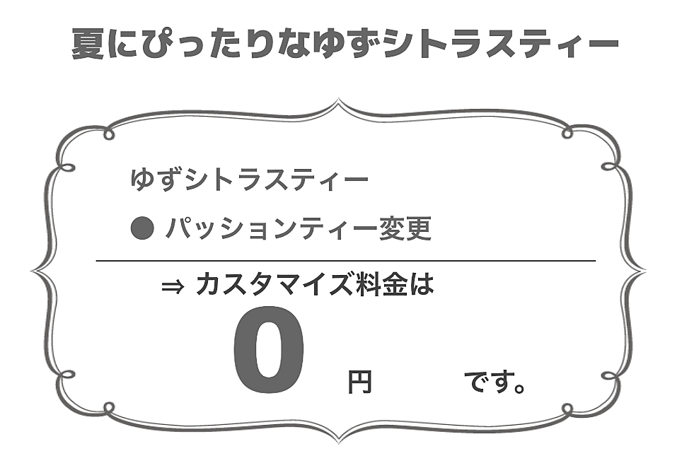 こちらのカスタマイズは、使用されているブラックティーをパッションティーに変更したドリンクで、通常のゆずシトラスティーよりも、さっぱりとした味わいに仕上げることができます。