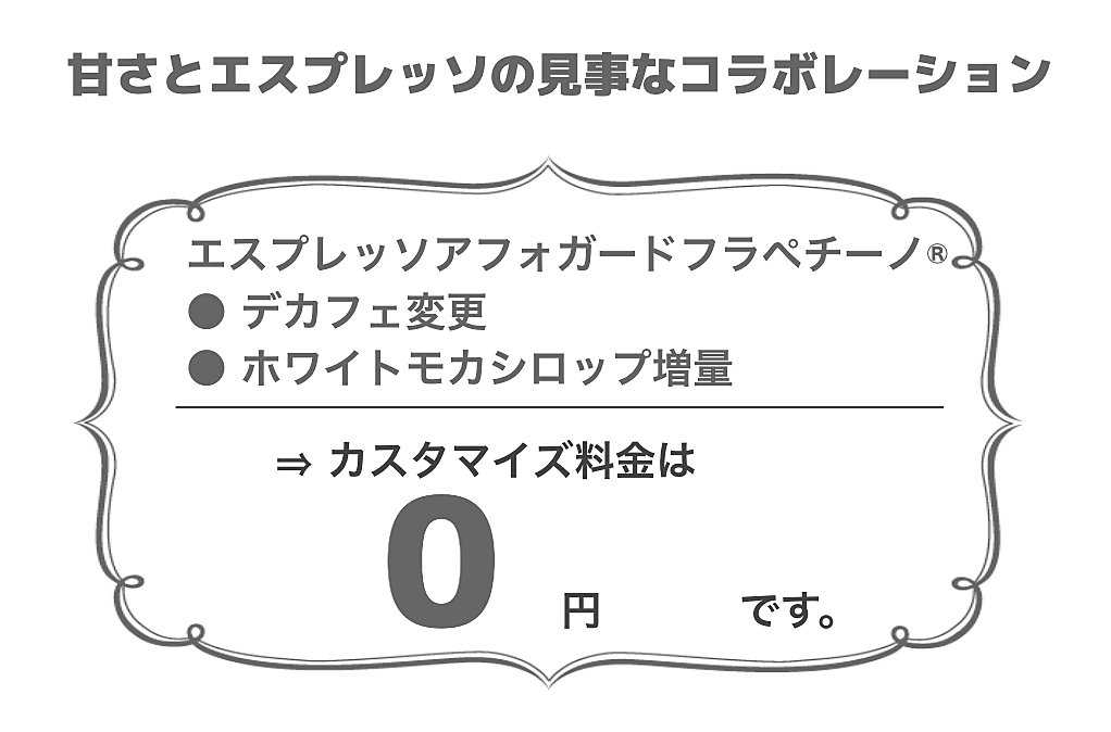 こちらは、エスプレッソアフォガードフラペチーノ®︎の甘さを強くして、エスプレッソをデカフェにしたカスタマイズドリンク。