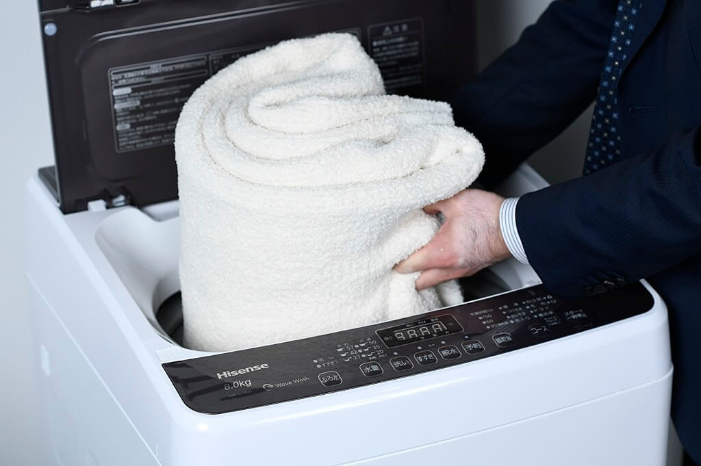 譚さん:8.0kgサイズは、このように大きな毛布も丸洗いできる容量なので、たとえば週末のまとめ洗いや、旅行後のたまった洗濯物も大丈夫ですよ。
