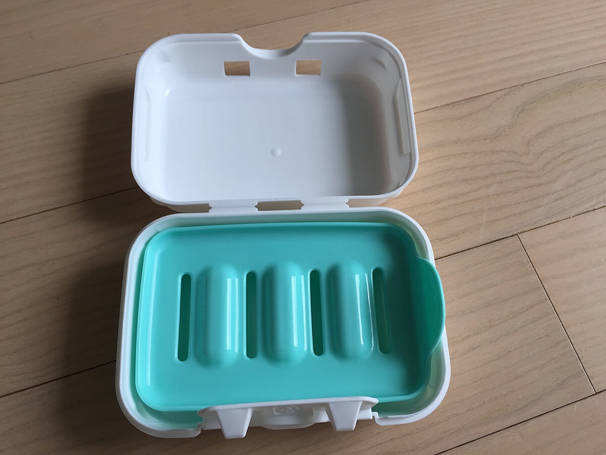受け皿がついているので、そのままフタをしてしまっても大丈夫!私にとっては、まさに理想の石けんケースでした。