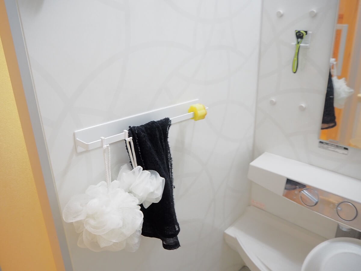 既存のタオルバーは、背が高い位置にありすぎて子どもたちが使いづらく、洗剤ボトル類などの収納に使うことにしたので、高さを変えて収納できるマグネットハンガーはとてもありがたい存在です。