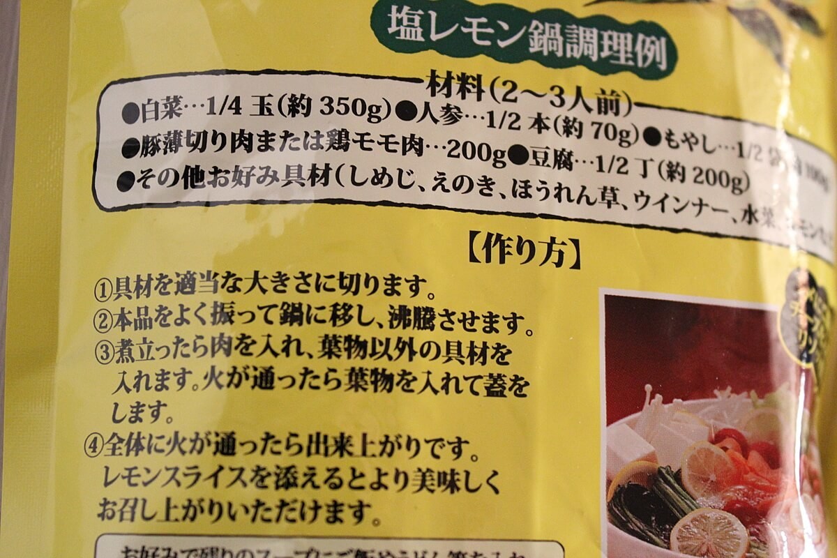 今回使ったのは塩レモン鍋つゆ1袋、600gです。材料の量も袋に書かれている位を用意しました。