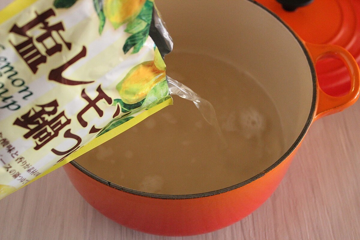 まずは塩レモン鍋つゆをよく振ってから鍋に全量入れます。