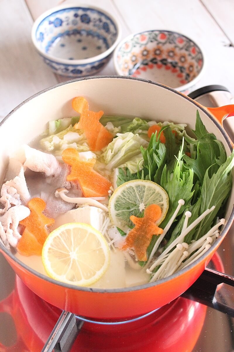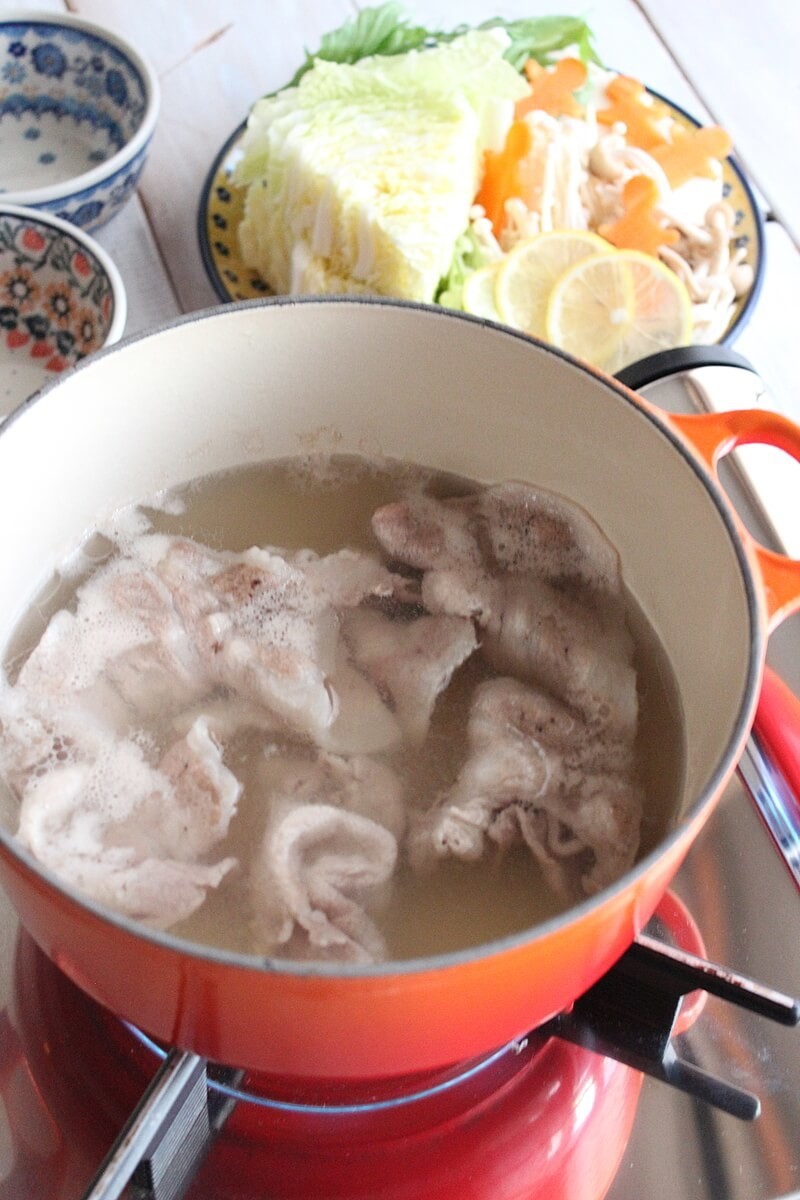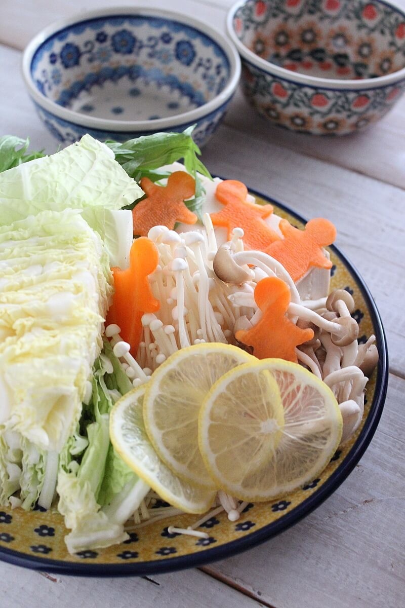 白菜、エノキ、しめじ、豆腐、人参、水菜、そしてレモン。豚肉は薄切りロースにしました。