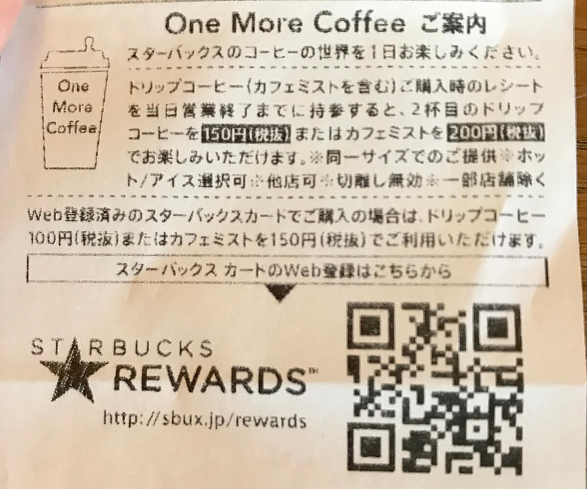 スタバではドリップコーヒー(カフェミストを含む)を購入すると、1杯お得に購入できる“ワンモアコーヒー”というおかわりサービスがあります。