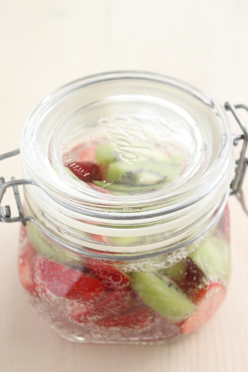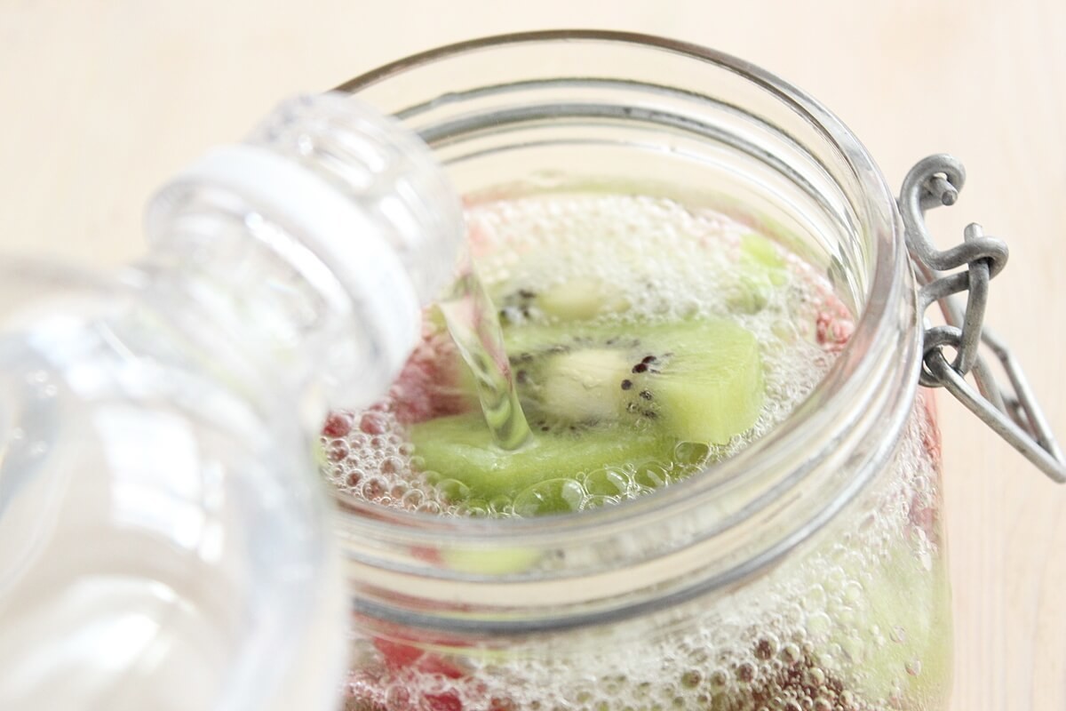 フルーツを密閉容器に入れ、炭酸水をつぎ、