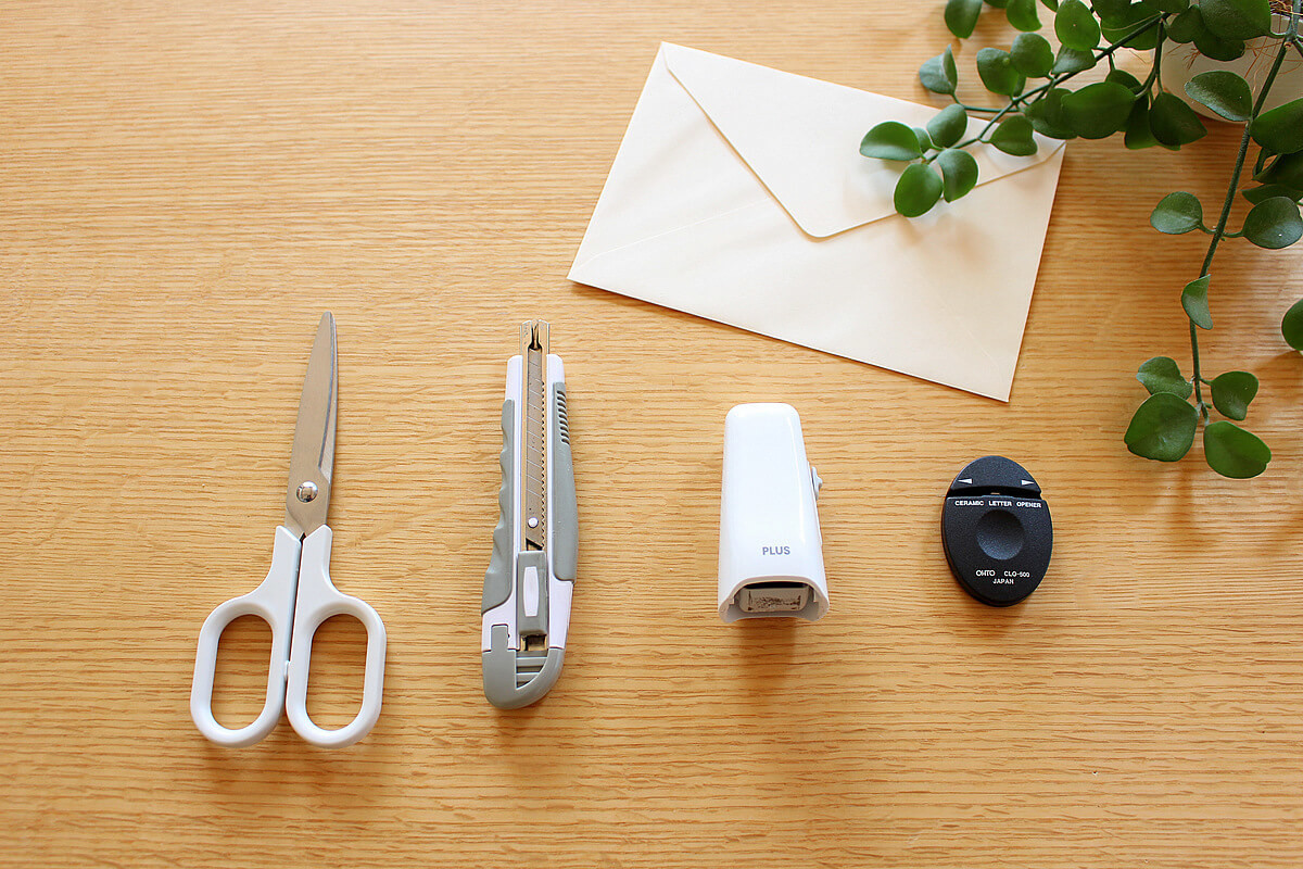 そしてその隣には、封筒や段ボールの開封に使う道具をまとめて置いています。