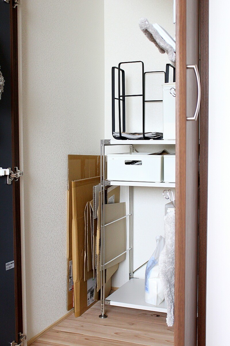 特に我が家はネットでのお買い物が多いのですが、それ関連のものを暮らしスペースに持ち込まない仕組みを、玄関の近くに作りました。