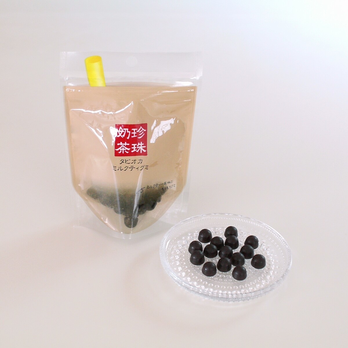 ミルクティー風味のもちもちグミで、タピオカでんぷんもしっかりと原材料に使われています!