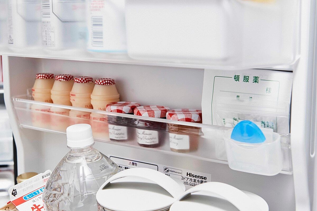 ハイセンスの冷蔵庫には、小物のための小さなポケットが中段にあり、小物を並べて見える状態にしておけます。