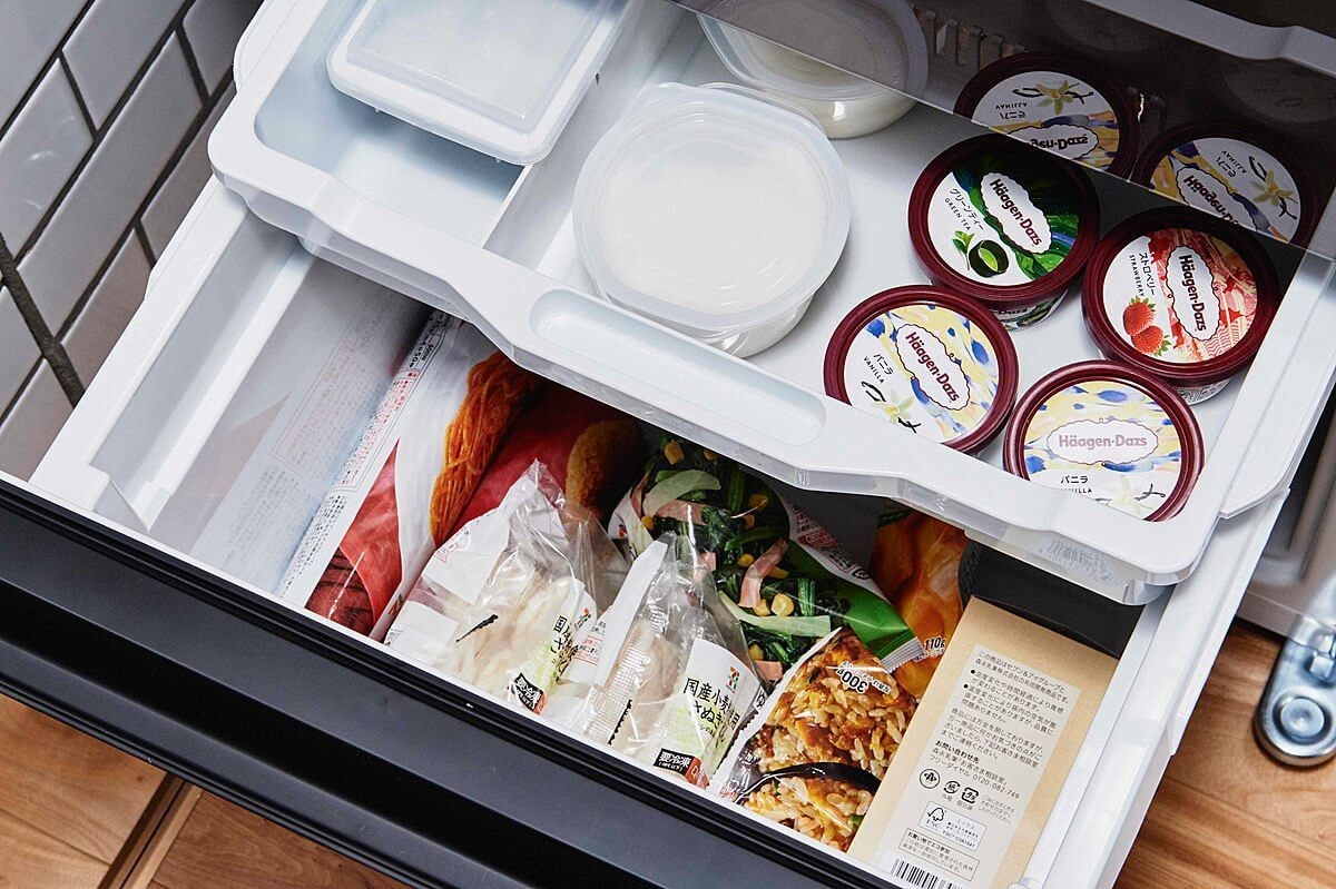 たとえば、冷凍うどん、冷凍パスタ、冷凍おにぎりやチャーハン、さらにカット野菜や箱入りアイスなどが、ひと通り収納できます。