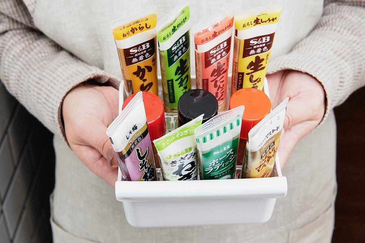 上田さん:冷蔵庫扉の真ん中のポケットは、小さな乳製品やジャム、薬や目薬などの小物を収納するのにぴったりの場所。ところが、小物は迷子になることも多く、スッキリ収納を保つにはひと工夫が必要です。