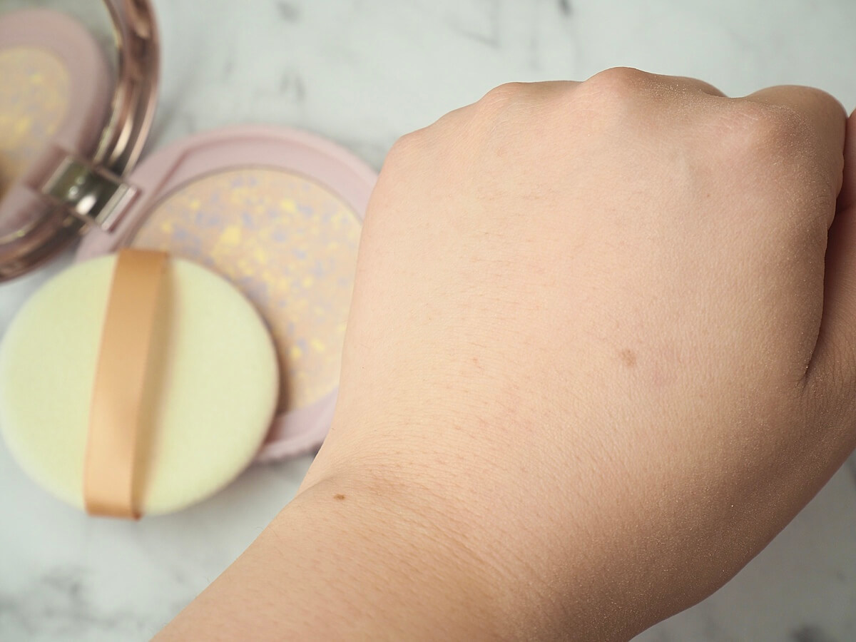 もちろん、パフでお粉を取ると混ざり合ってしまうので単色で使用することはできませんが、混ざったお粉を肌にのせると自然な透明感が出て、簡単に美肌を作ることができます。