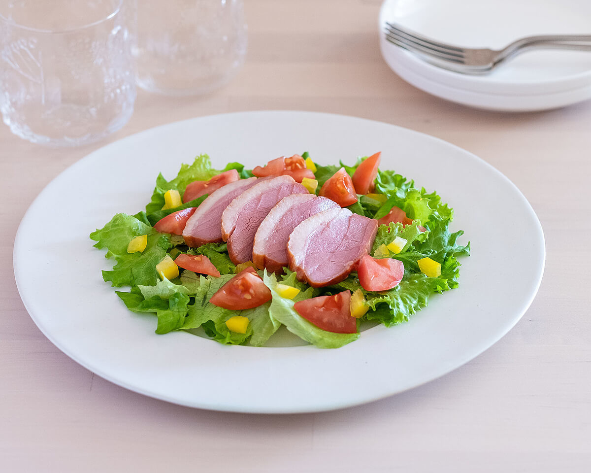 フレッシュなお野菜と一緒に、スライスした合鴨ロースを盛り付けておいしいサラダに。