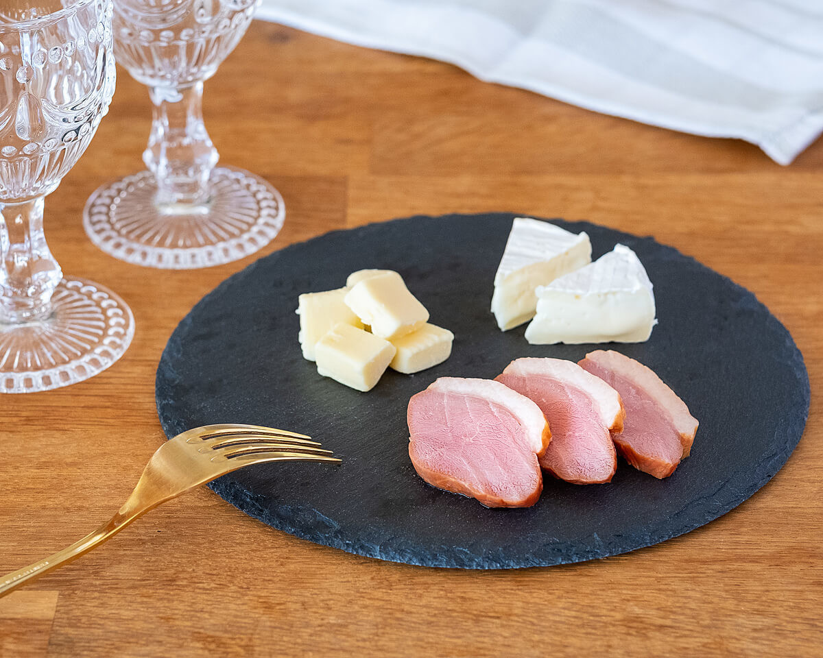 スライスした合鴨スモークとチーズを一緒に盛り付ければ、オードブルにも。