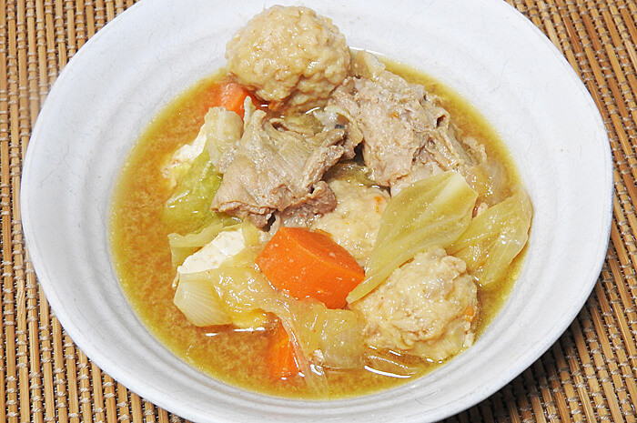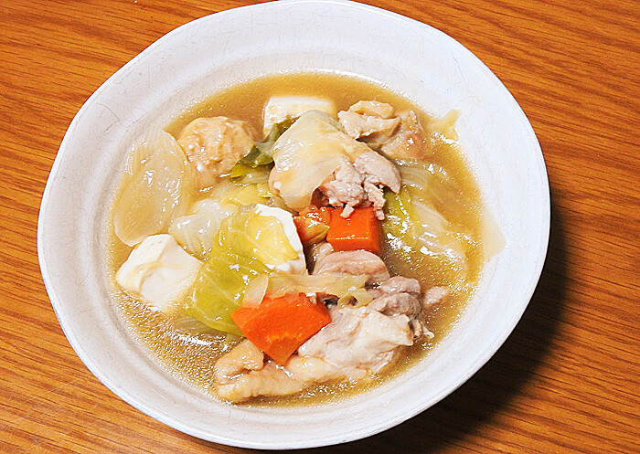 - 豚肉、野菜、つくね団子を鍋に入れて火が通ったら、最後に豆腐を入れる