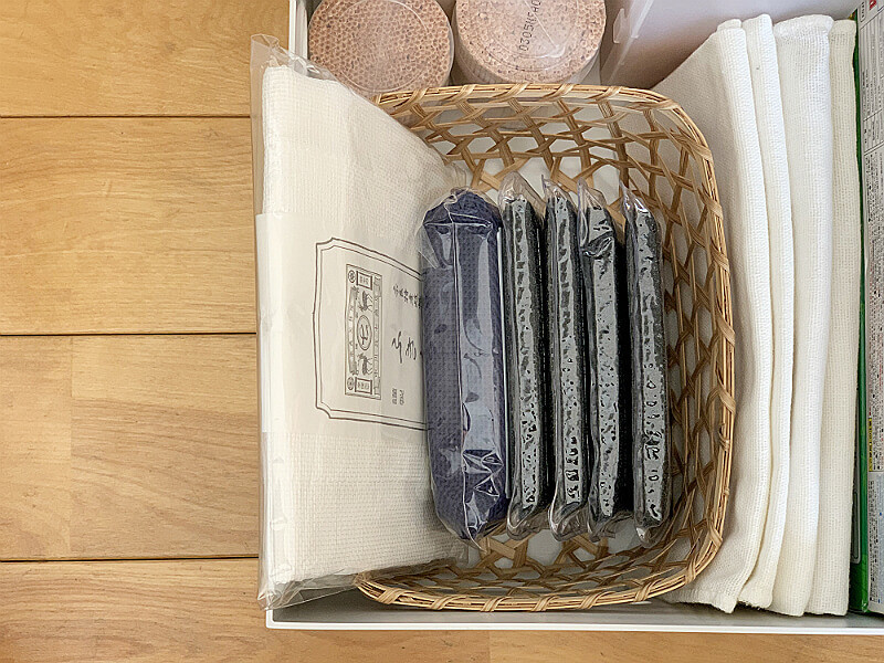 キッチンの収納には、いつでも取り替えられるようにたくさんのスポンジがストックされていたのでした。