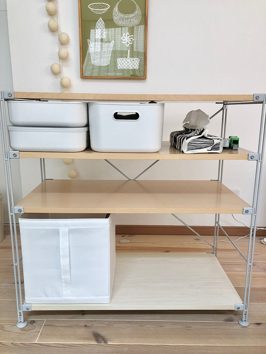 リビングには他に収納がないので、このシェルフにリビングで必要なものをだいたい収納しています。