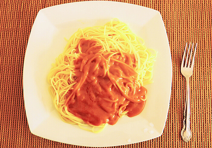 - 電子レンジ…パスタソースを深めの耐熱容器にうつして、加熱。500W・約1分。600W・約30秒