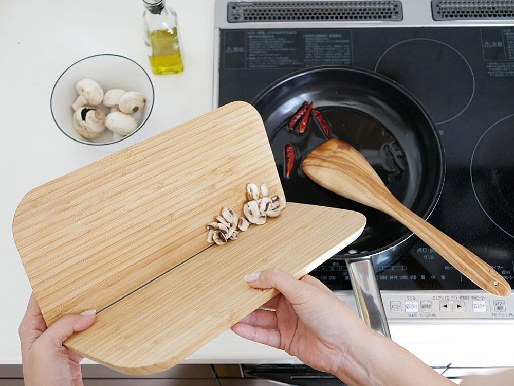 耐久性の高いシリコーン製のヒンジでストレスなく折り曲げられ、切った食材をこぼさず簡単にお鍋に移すことができます。