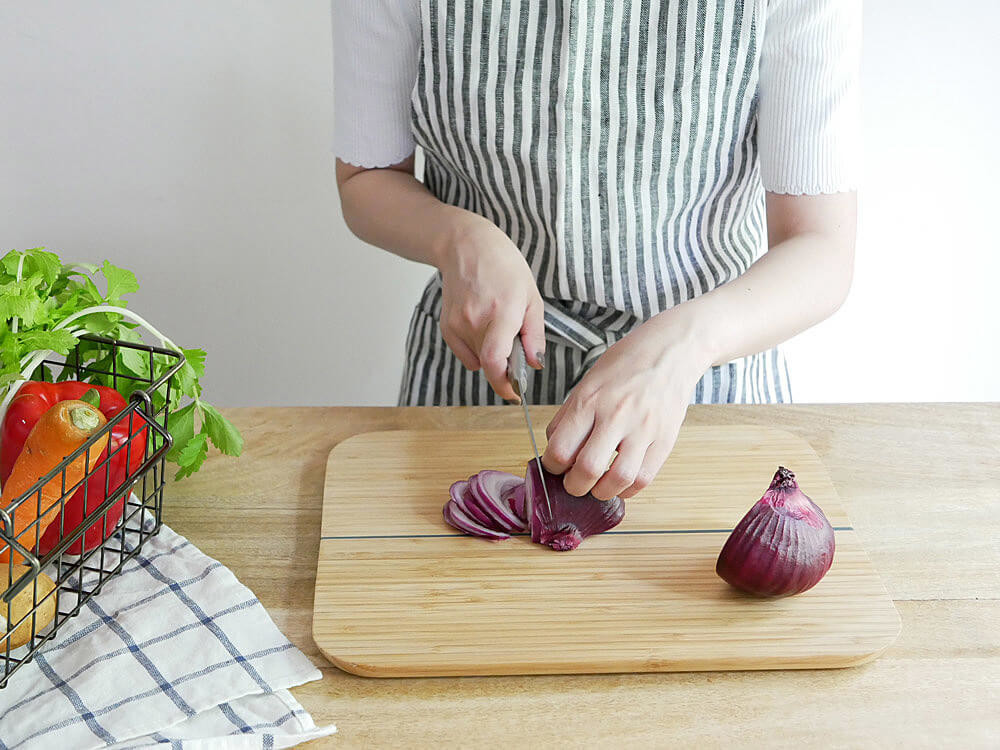 折りたためるまな板は、折り目があるから段差ができてしまい切りにくい?と思いがちですが、「チョップ2ポット バンブー」は、折り目が気にならずしっかりフラットになるので、普通のまな板と同じようにストレスなく食材を切ることが出来ます。