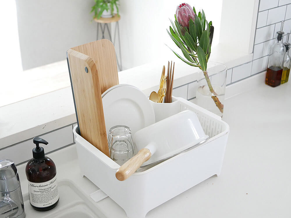 折りたためることで水切りかごの中でも場所を取らず、たくさん洗い物があってもコンパクトに収まります。
