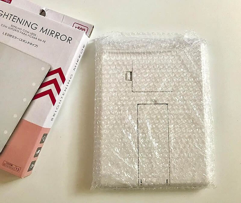 衝撃に耐えられるようにプチプチのクッション。鏡の表面にはフィルムが貼られてありました。さすが500円!じゃなくて、さすが女優!!