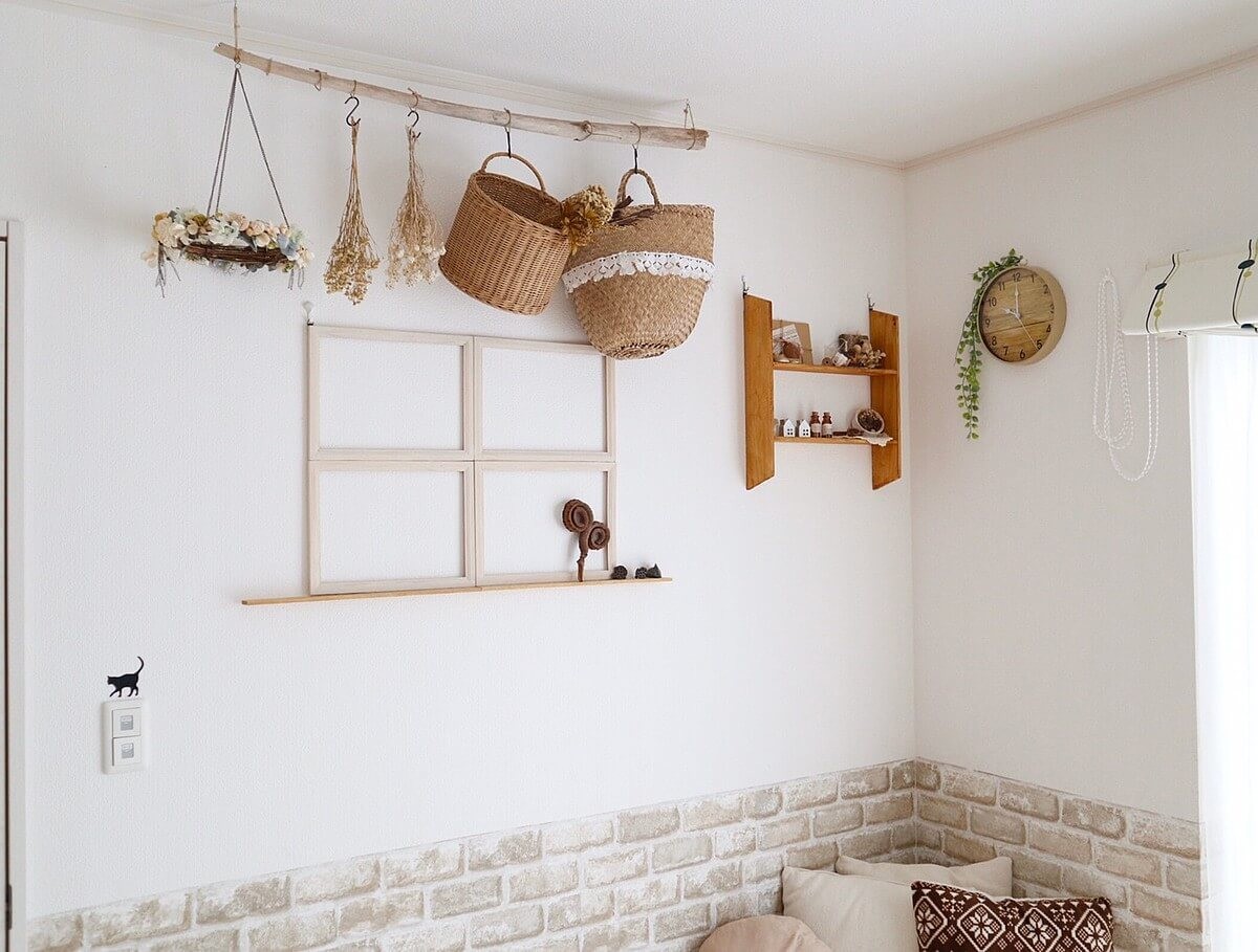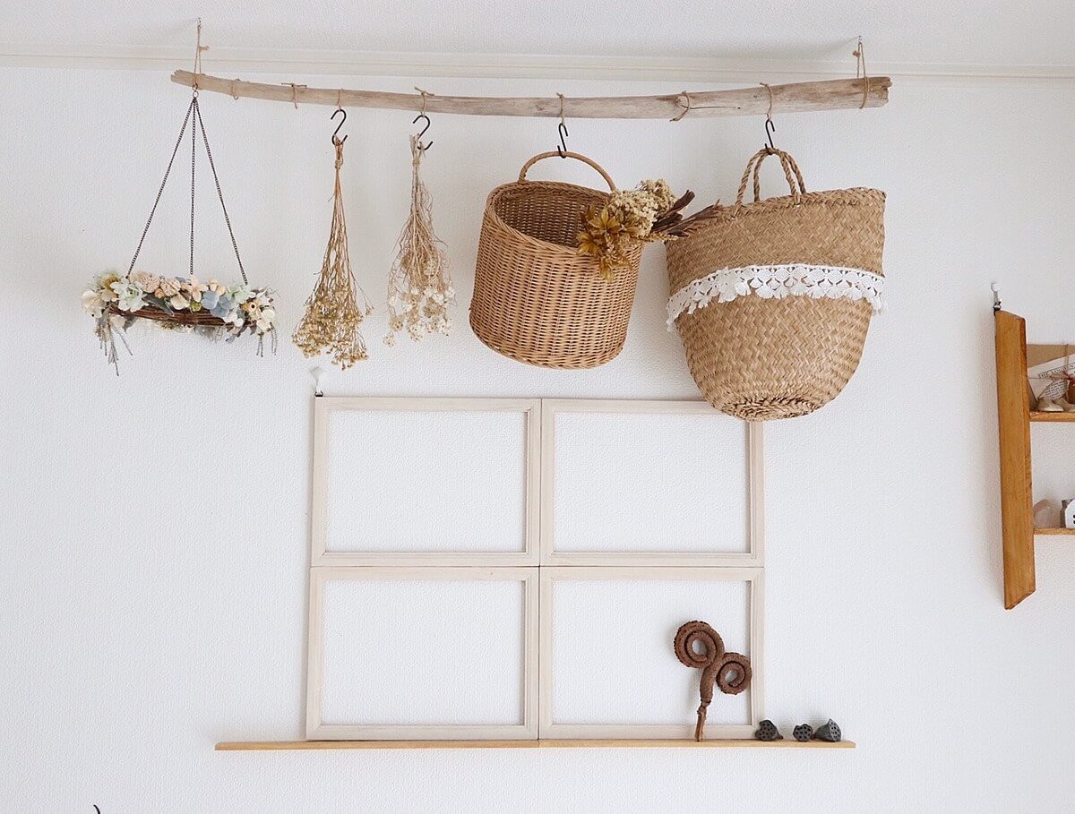 流木にカゴを吊るして、その中にドライフラワーを入れて飾るだけでオシャレなお店のような雰囲気に。