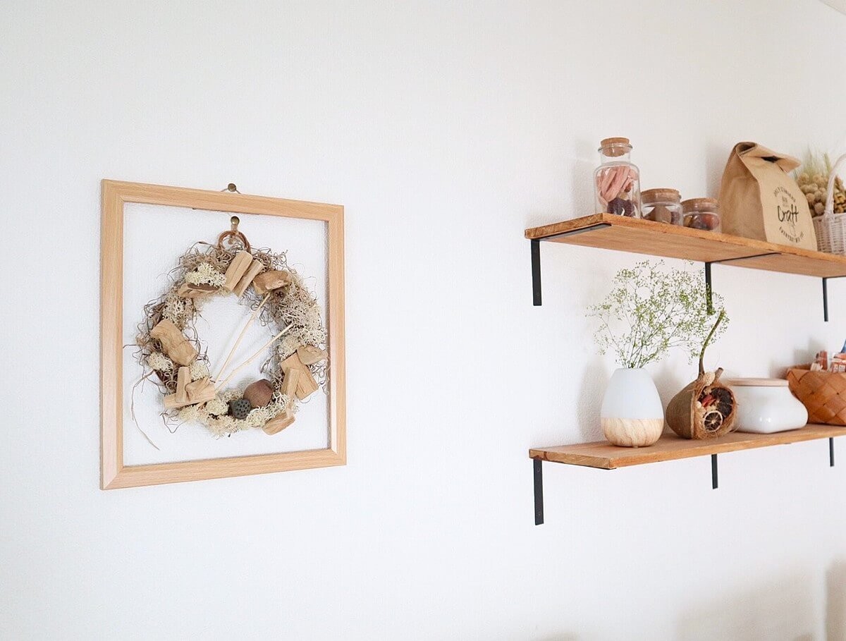 フレームにドライフラワーのリースを合わせました。 北欧のポスターフレームのような眺めに。キッチンを一気にオシャレに演出してくれます。