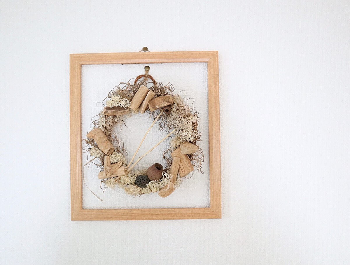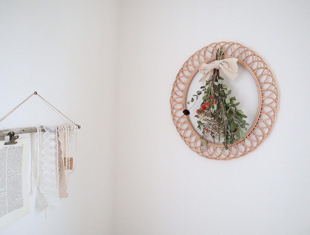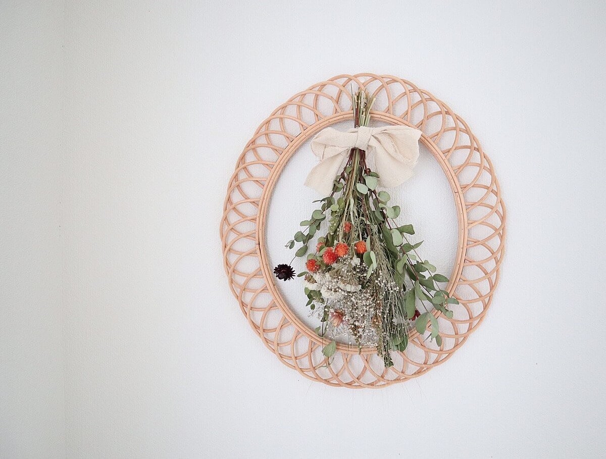 丸いフレームにもドライフラワーの相性は抜群。こちらのフレームは元々は鏡、ラタンミラーです。