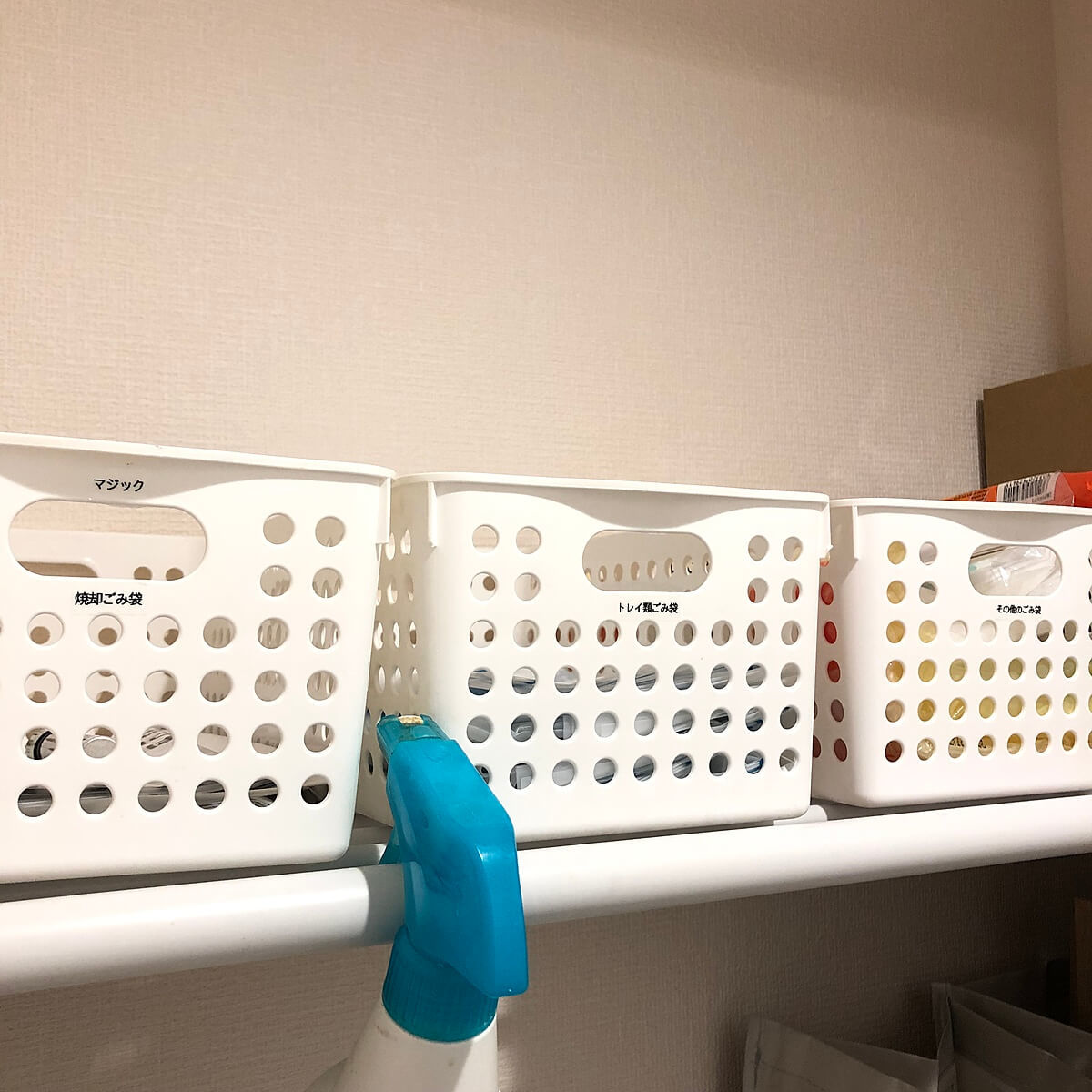 これは以前から取り入れていた方法ですが、各種ゴミ袋をそれぞれ袋から出して分けてカゴに収納しています。