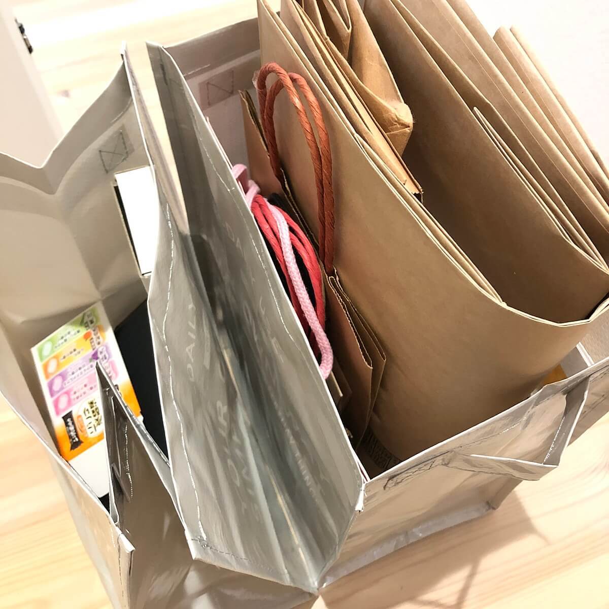 紙袋はこの袋に入るだけ、箱類のストックも袋がいっぱいになると幼稚園に持っていく仕組みにしたいと思います。