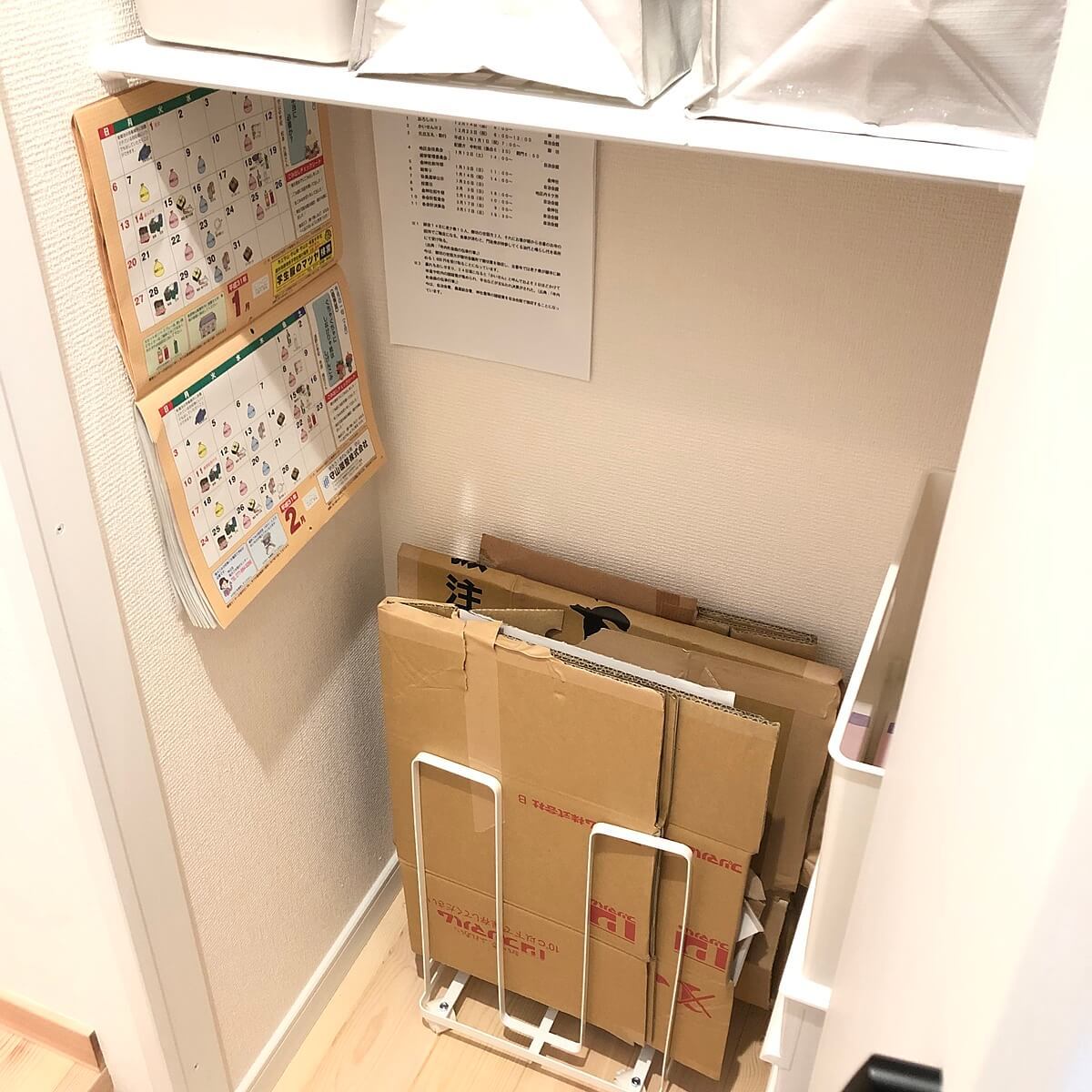 今まで廃棄するダンボールの定位置を決めておらず、パントリーや別の納戸の隙間などに置き、なんとなくゴミ回収の日を待っていましたが、思い切ってここを定位置としました!