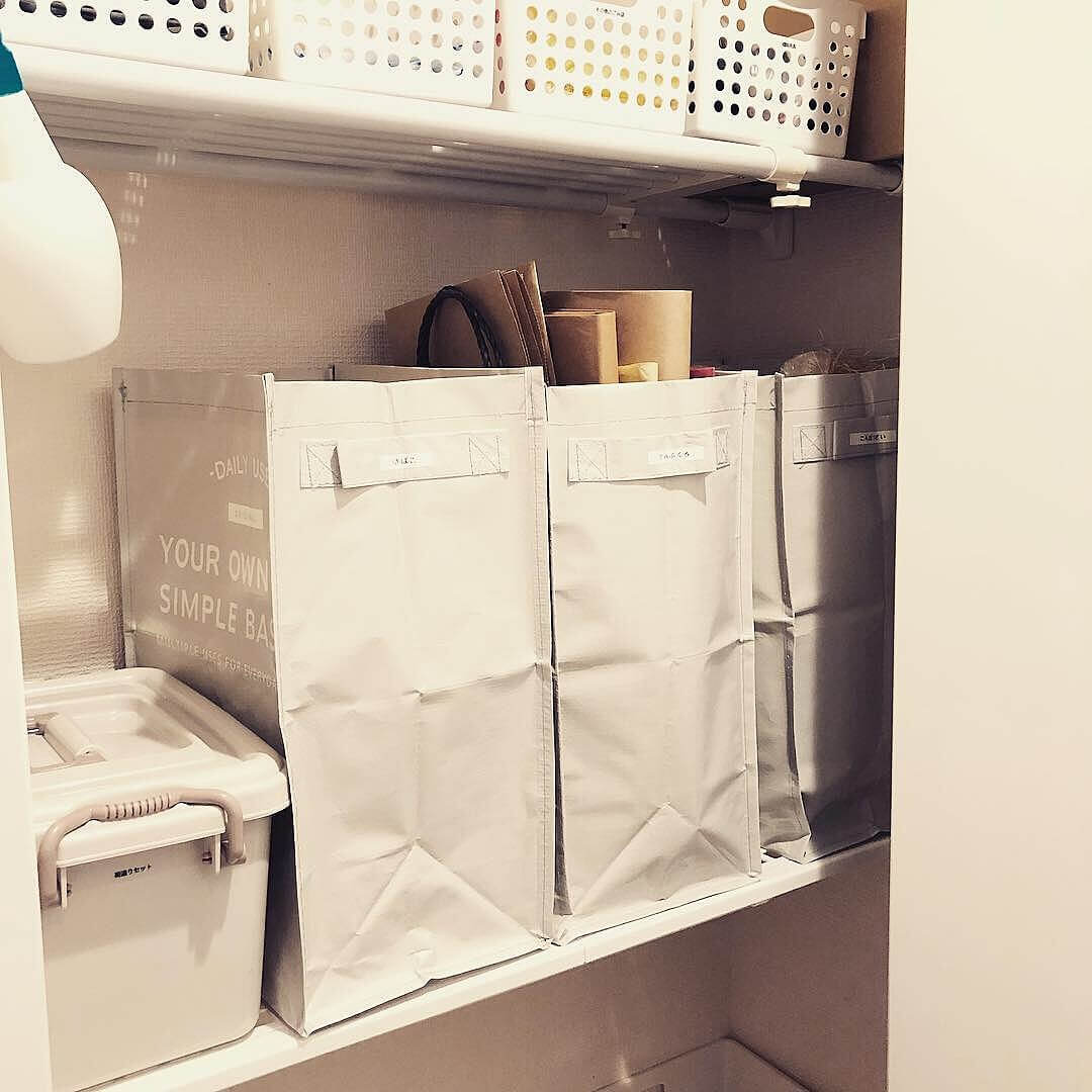 セリアで購入したランドリーバスケットには、紙袋のストックと幼稚園に提供する箱類のストック、梱包材を入れました。