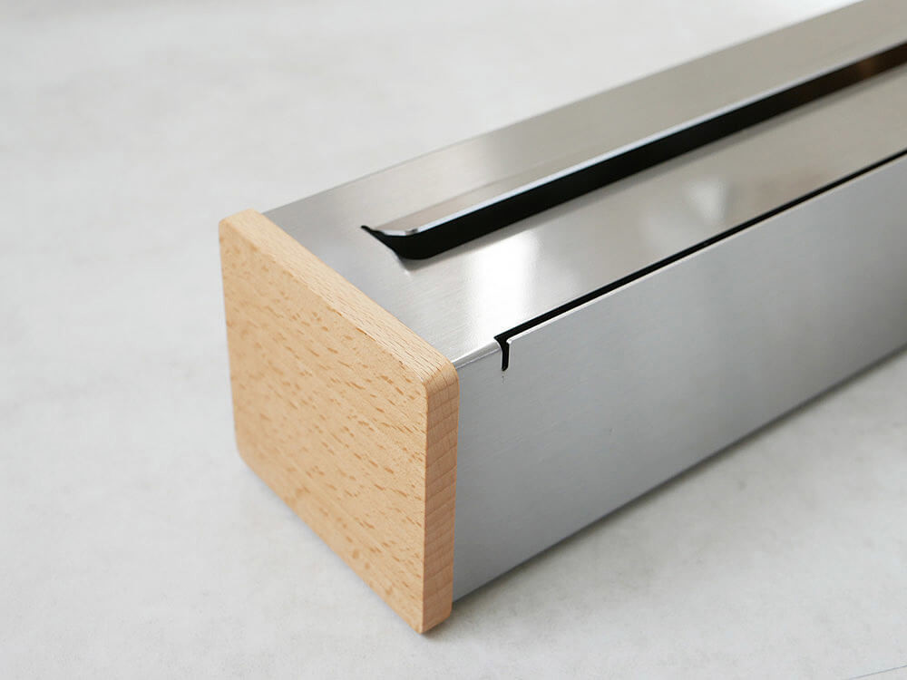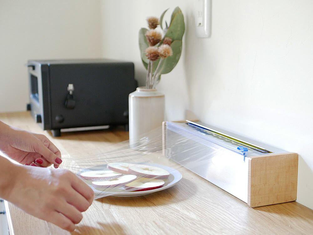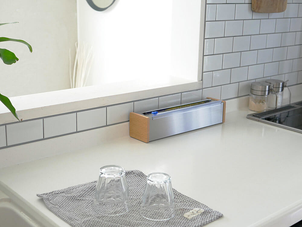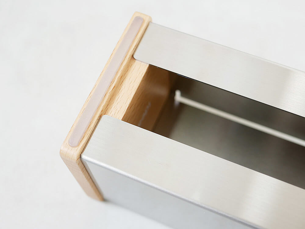 両サイドには天然木のブナ材を、底には滑り止めを設け、ラップが引き出しやすく使いやすいのが特徴。