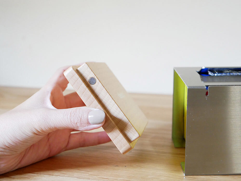 本体の両側にある木製の蓋には、小さなマグネットが3か所あります。開閉は取り外すだけで簡単ですが、しっかりと固定されます。