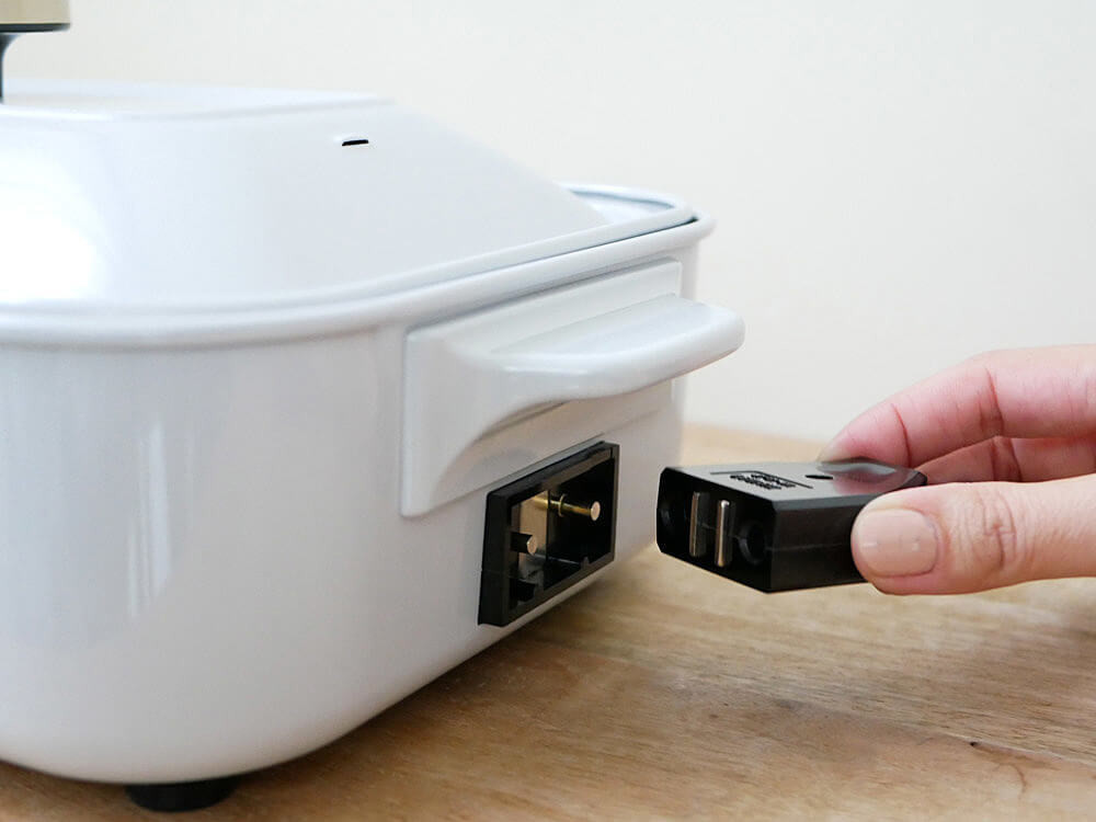 プラグ受けは本体右側面にあり、コンセントはマグネット式。万が一コードに足をひっかけても、簡単に外れるようになっているので安心です。