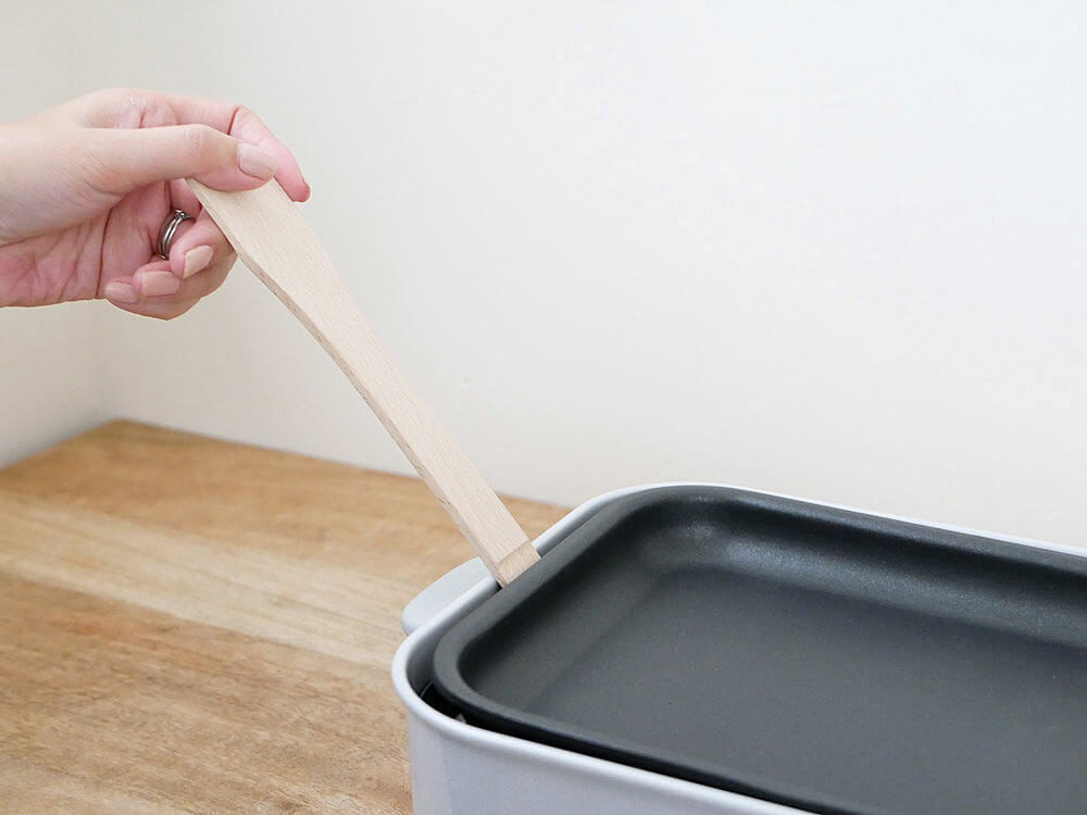 具材を混ざるのに便利な木べらは、逆さにすると本体に設置したプレートの取り外しにも使える優れものです。