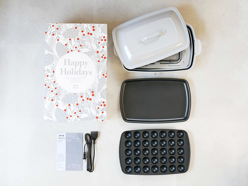 本体、平面プレート、たこ焼きプレート(全35穴)、フタ、 フタ用取っ手、マグネット式脱着電源コード、保証付きの説明書、クリスマス限定スリーブがセットになっています。