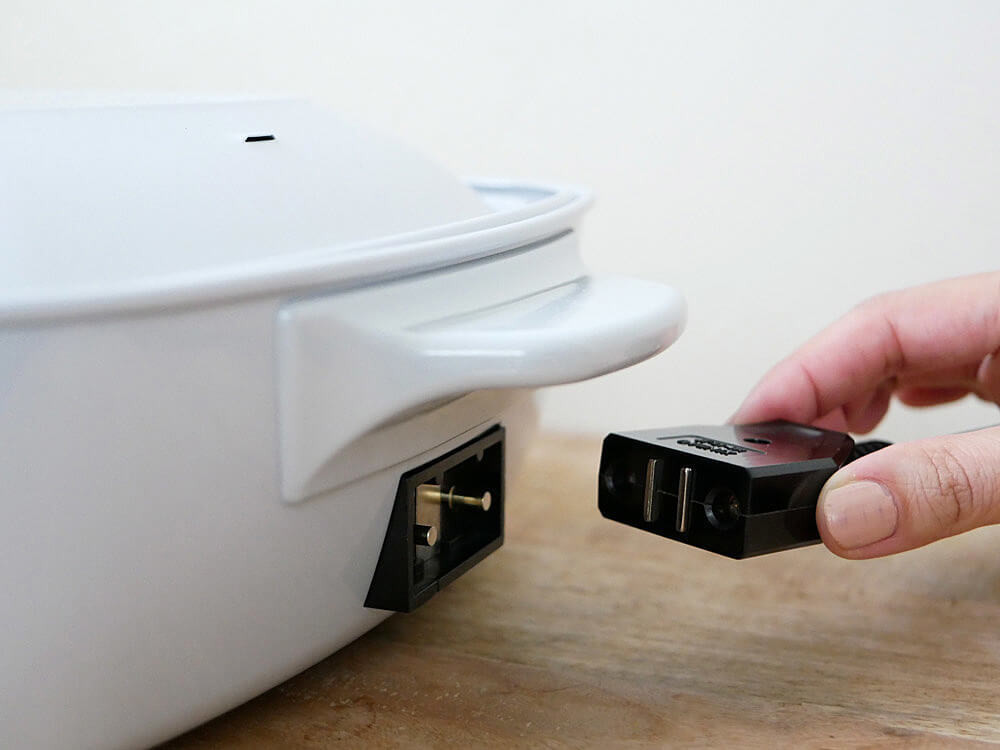 プラグ受けは本体右側面にあり、コンセントはマグネット式。万が一コードに足をひっかけても、簡単に外れるようになっているので安心です。