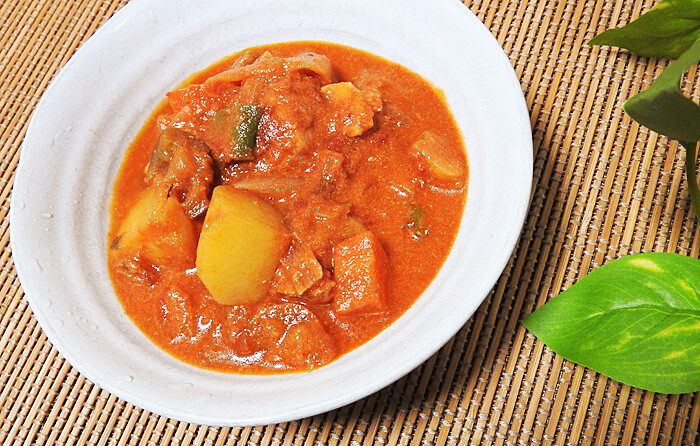 濃厚なトマトと牛乳のまろやかさが最高の野菜のトマト煮が完成しました。子ども好みの味に仕上げるため、牛乳を多めに入れています。トマトの味をもっと強調したい場合は、牛乳の量を少し減らしてみて下さいね。