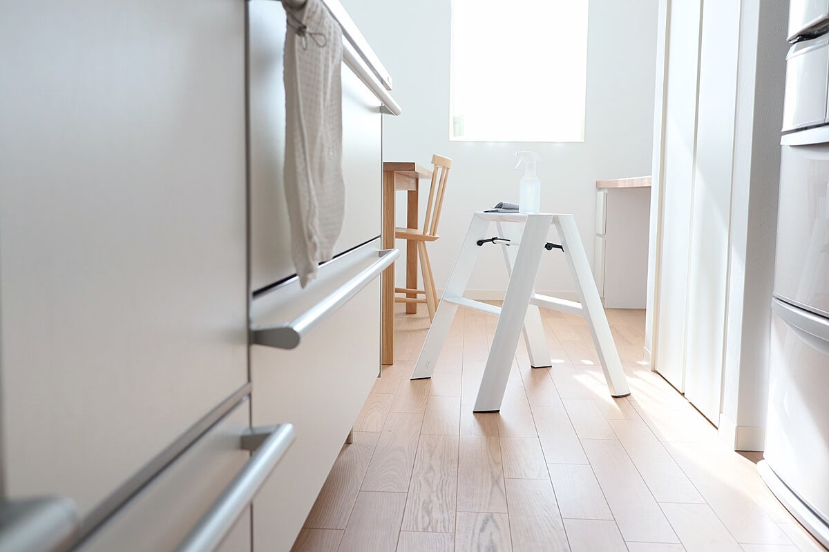 今では使う場所の近くにステップを用意しています。高いところにあって手が届きにくい窓の下には壁にステップを掛けて、冷蔵庫上や換気扇上も汚れが見えにくいのでリビングにもステップを用意しています。