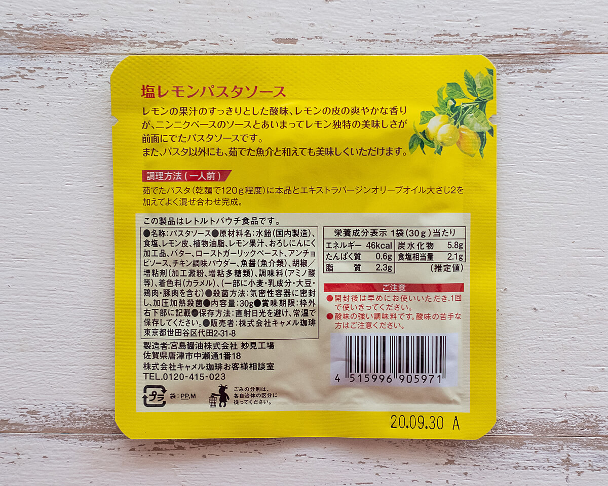 こちらが、カルディで大人気の「塩レモンパスタソース」。小さめに見えますが、1袋で1人前です。
