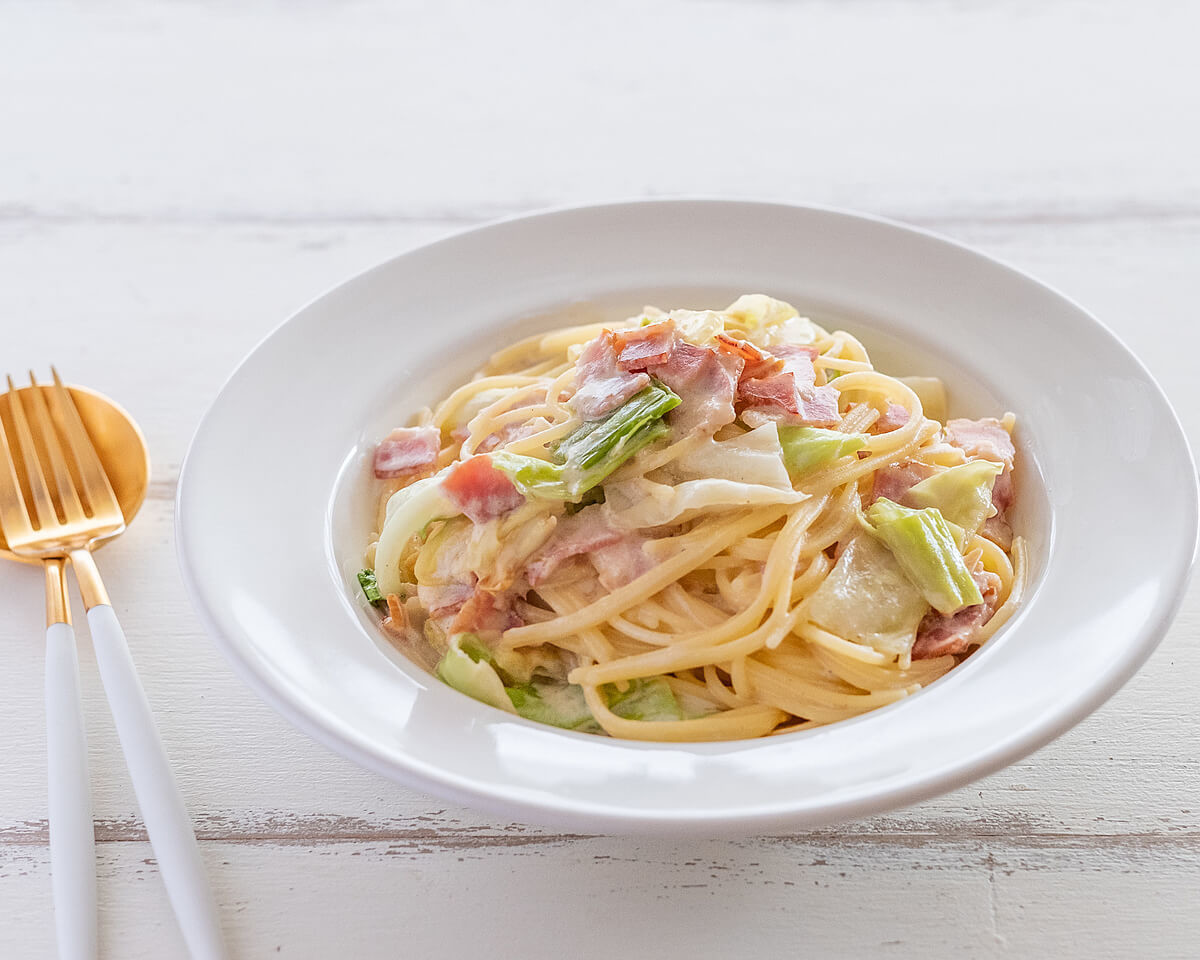 そのままでもじゅうぶんおいしい「塩レモンパスタソース」ですが、家にある野菜などと一緒に、牛乳と生クリームを加えてクリームパスタにしていただいてもとてもおいしいんです!