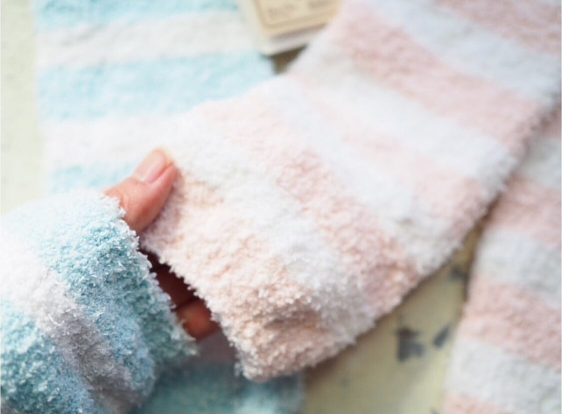 続いてご紹介するのは、もこもこ素材にピンクとブルーのボーダーがかわいい「手首足首ウォーマー マシュマロボーダー」です。