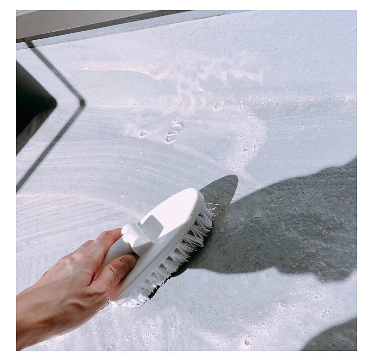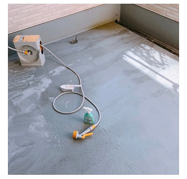 ベランダ床を水で濡らして、ウタマロクリーナーをスプレーして、ひたすらゴシゴシ!!